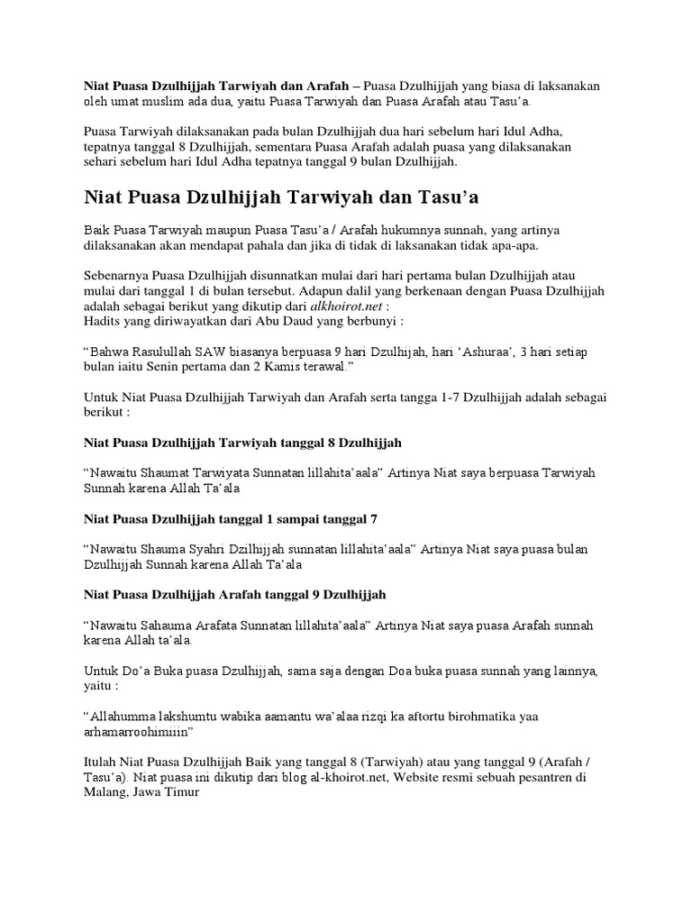 Niat Puasa Dzulhijjah Tarwiyah Dan Arafah