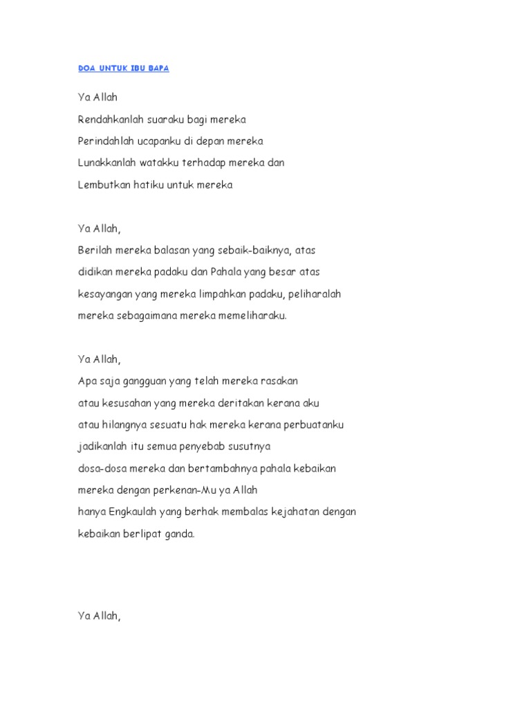 Doa untuk ibu. Doa untuk kedua ibu dan bapa yang kita kasihi anak anakku setiap kali lepas solat fardu 5 waktu berdoalah kepada kedua2 ibu bapa kamu sebagaimana mereka mendoakan kesejahteraan kamu di dunia dan diakhirat. Tentu saja karena bersumber dari al quran kalamullah. Antara cara untuk mendapatkan keberkatan adalah melalui doa ibu bapa.
