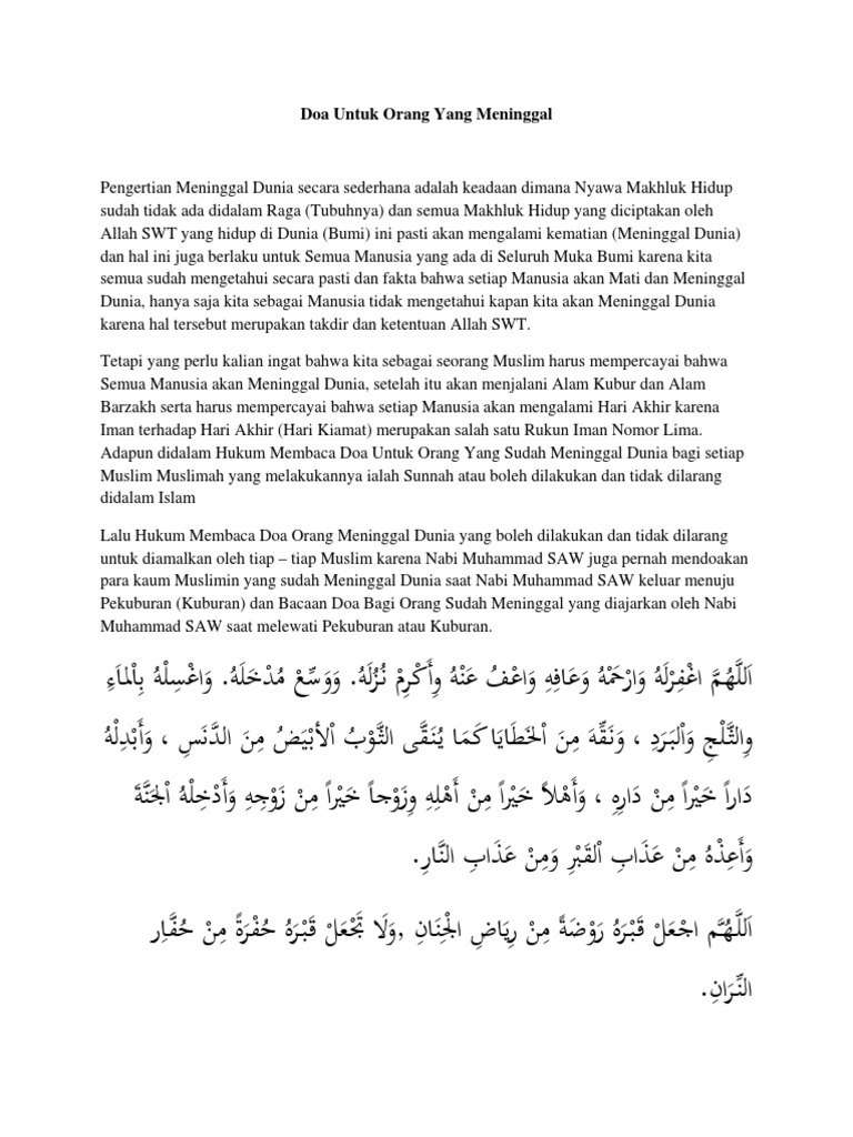 Doa untuk mayat perempuan allhm aghfr lha oarhmha oaaafha oaaaf aanha oakrm nzlha oosaa mdkhlha oaghslha balma oalthlj oalbrd onkha mn alkhtaya kma nkyt. Doa untuk orang meninggal dunia pengertian orang meninggal dunia jika dilihat secara umum ialah keadaan terpisahnya ruh seseorang dari jasad dan jika dilihat dari ilmu dokter bahwa orang dikatakan sudah meninggal jika jantung orang tersebut sudah berhenti berdenyut sehingga tidak bisa melanjutkan lagi kisah hidupnya di dunia ini. Kiriman doa tersebut ternyata lebih diinginkan dibandingkan dunia dan seisinya.