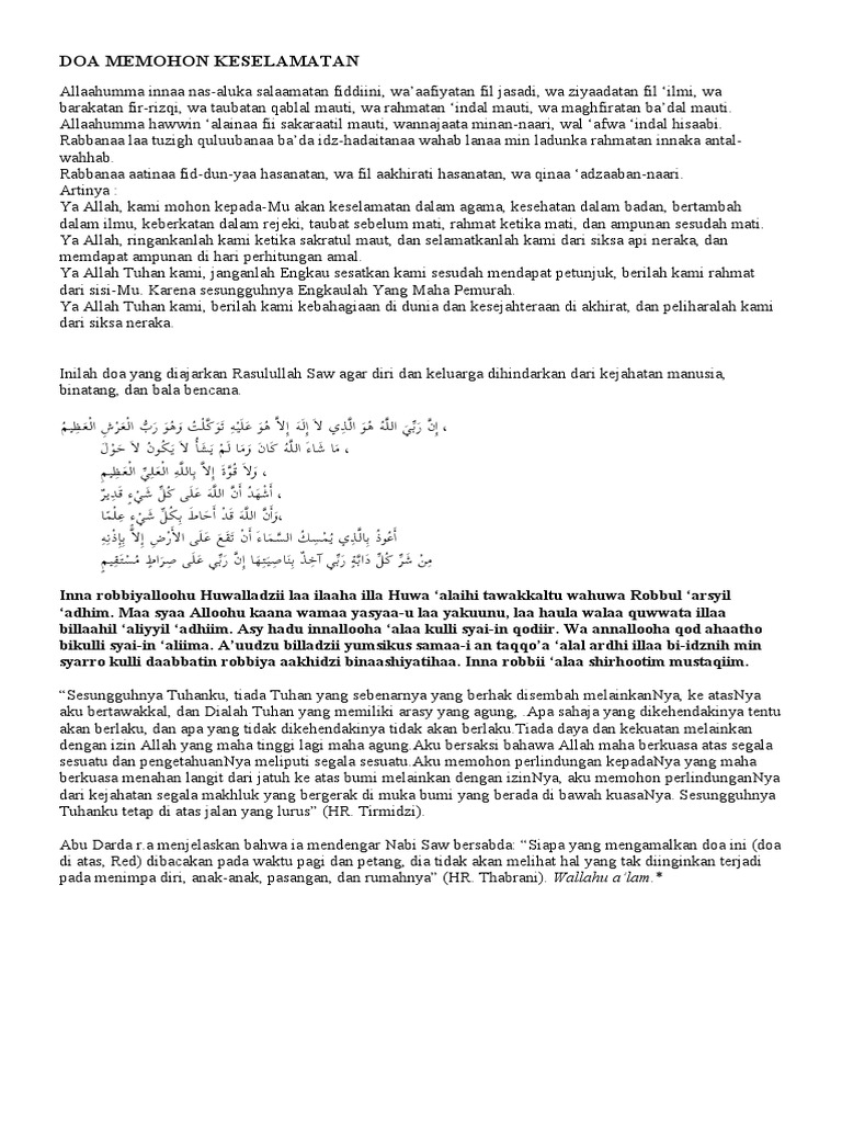 Assalamu alaikum sahabat pada kesempatan kali ini saya akan membagikan artikel doa memohon keselamatan di dunia maupun di akhirat yang mana mudah mudahan dapat berguna bagi para sahabat yang sedang mencari doa ini berikut saya sajikan doa memohon keselamatan di dunia dan di akhirat lengkap dengan arab latin beserta artinya yang mana penyajian artikel saya sajikan doa selamat ini biar mudah. Karena didalam setiap sarana nur salamah mengandung kekuatan supranatural yang bisa menjaga dan melindungi anda. Doa keselamatan diri dan keluarga ddhk news 31 january 2013 1 april 2014 mutiara hikmah 7 inilah doa yang diajarkan rasulullah saw untuk keselamatan diri dan keluarga agar diri dan keluarga dihindarkan dari kejahatan manusia binatang dan bala bencana.