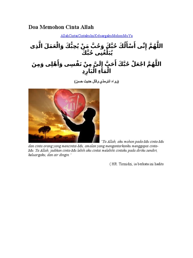 Nabi muhammad bersabda ya allah aku memohon cinta mu dan cinta orang yang mencintai mu dan cinta terhadap amalan yang akan mendekatkanku kepada cinta mu mencintai allah adalah merupakan kewajiban bagi hamba hingga allah swt menjadi lebih dia cintai daripada siapapun dan apapun. Allaahumma innii as aluka hubbaka ya allah aku memohon agar dapat mencintai mu. Doa memohon cinta kepada allah.