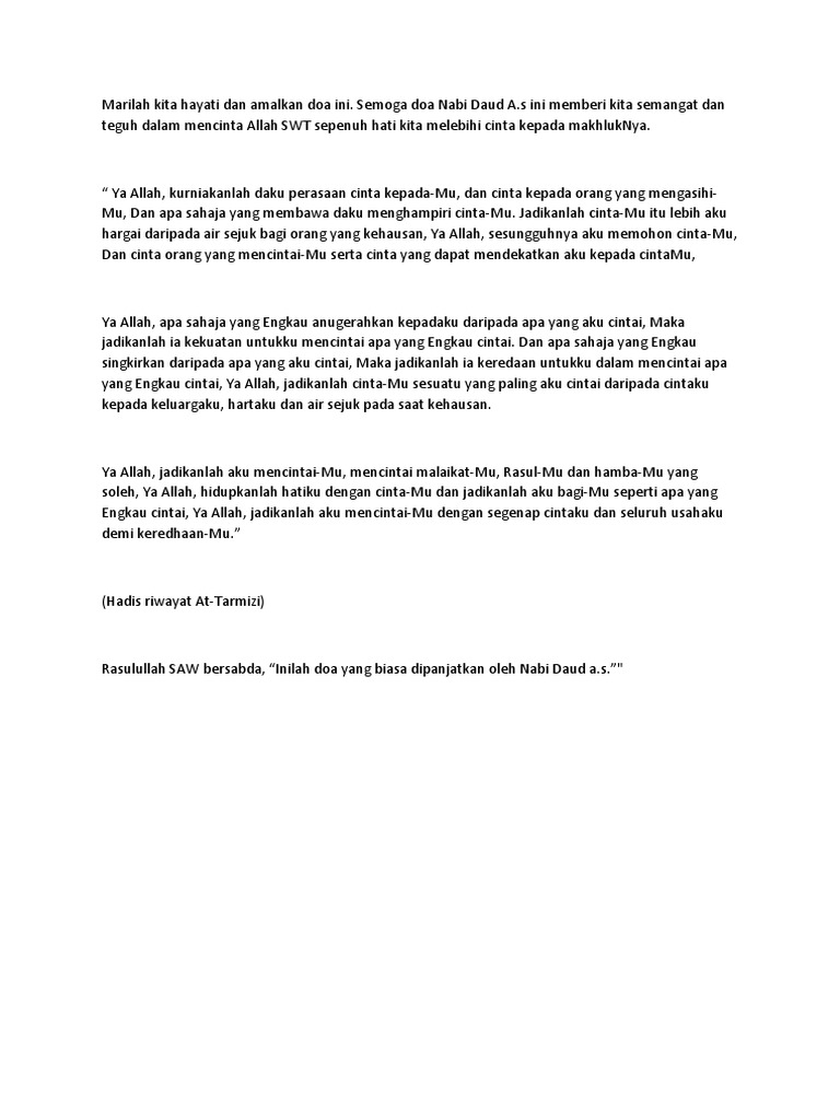Hal ini tentu sesuatu yang selalu diidam idamkan oleh setiap hamba nya. Allhm eny asalk hbk. Doa nabi daud memohon cinta dari allah inilah doa agar di cintai allah dari nabi daud as.