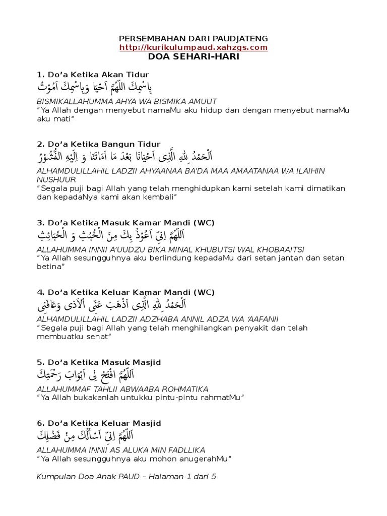 Bacaan hafalan doa sehari hari untuk anak materi pembelajaran tk paud. Mempersiapkan anak didik menjadi pribadi yang mandiri cerdas kuat tangguh terampil sholihsholihah berakhlak mulia dan berpegang teguh kepada nilai nilai ajaran islam yang rahmatanlilalamin misi.