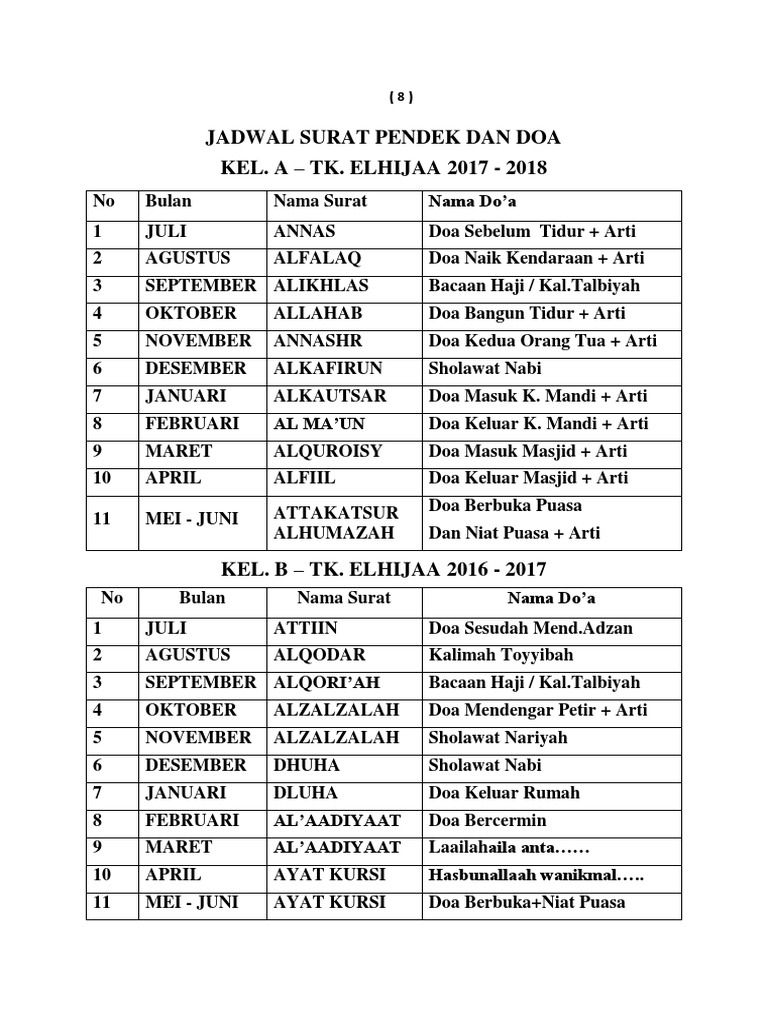 Jadwal Surat Pendek Dan Doa Kel A Tk Elhijaa 2017 2018
