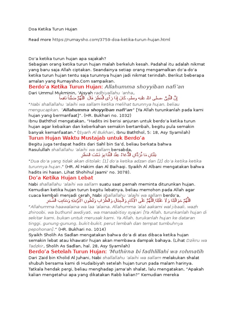 Doa turun hujan rumaysho. Turunnya hujan kesempatan terbaik untuk memanjatkan doa mensyukuri nikmat turunnya hujan mengambil berkah dari air hujan. Seandainya setiap orang mengamalkan doa doa ketika turun hujan tentu saja turunnya hujan jadi nikmat terindah. Padahal itu adalah nikmat yang baru saja allah ciptakan.