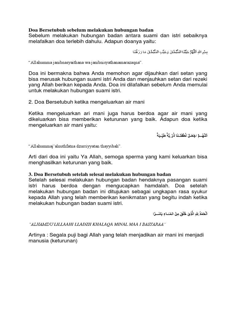Untuk lebih jelasnya berikut 3 lafadz doa bersetubuh suami istri menurut islam. Karena banyaknya permintaan dalam doa ini bisa dikatakan bahwa doa ini dapat dibaca untuk mendapatkan kebahagiaan di dunia dan akhirat. Seputar islam bacaan doa berhubungan suami istri arab latin dan terjemahannya.