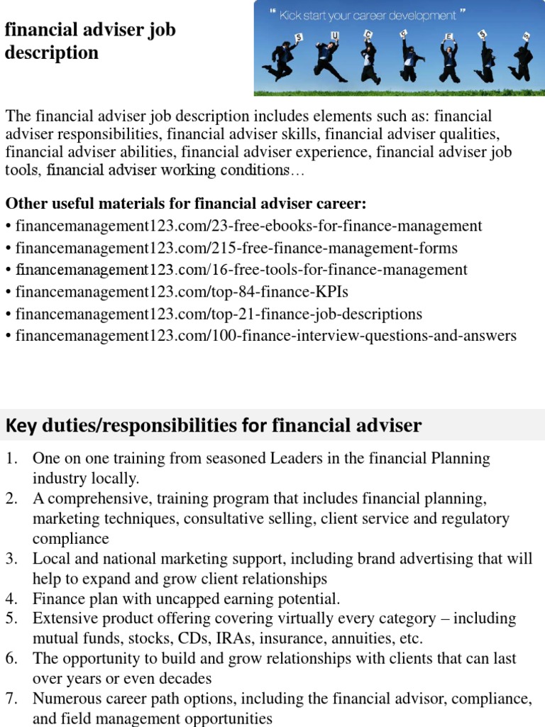 So use these template steps to get your ducks in a row Personal financial advisors provide effective investment strategies that generate good profits for their clients. Right out of college, within the industry, and outside the industry. Use our job search tool to sort through over 2 million real jobs. Home — financial advisor job description. Independent financial advisors typically earn money by charging a fee based on the value of clients' assets. After all, you want to be sure that you're working for a firm that will support you and give you the additional training and. As a first step, take a look at some of the following jobs, which. Personal financial advisors give financial advice to people. You can edit this financial advisor resume example to get a quick start and easily build a perfect resume in just a few minutes. Personal financial advisor job description, duties, and responsibilities. Financial advisors can have a career as an independent entrepreneur or work in a team such as insurance providers or banks. Duties personal financial advisors typically do the following
